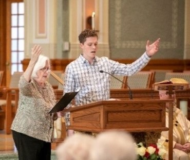 Janet O’Brien, who is a resident in Villa St. Benedict, and Cameron Warland sometimes cantor together. Janet started singing as a child when she joined the Catholic school choir. Now her lovely contralto voice is profoundly reverent as she glorifies God. Cameron has a clear, baritone voice inspiring prayerful worship. He studied music at Benet Academy and at Miami University of Ohio. He is hoping to return soon after the pandemic.