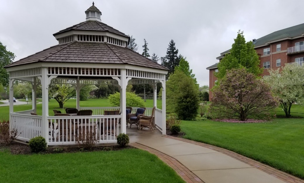This photo shows a restful bench dedicated with thanks to David Burnett by our Benedictine Sisters. David was our faithful handyman in charge of our buildings and grounds for 39 years. The cupola that stands opposite of the bench is the former artifact that stood on the roof of the Benedale building for many years and now symbolizes David’s appreciated tenure. Here is, as well, the starting point of the walkway that extends around our entire campus. It is a favorite path to follow for many of our residents and Sisters to exercise. As they walk, they can observe the beauty of nature by listening to the sounds of the bird calls, seeing the variety of flowers in the grotto and enjoying the warmth of the sun and often the cool, delightful breeze.
