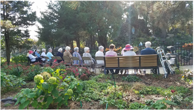 This picture was taken on the Feast of the Holy Rosary, October 7, 2019. Here the Residents, as a group, prayed the Rosary at the Grotto. How wonderful these memorial benches were to accommodate the whole vast group in the days before the coronavirus social distancing order. This is such a peaceful scene of our praying residents among the trees, with sunshine piercing through those trees and, of course, the plants who are now receding in October’s weather. What wonderful memories!