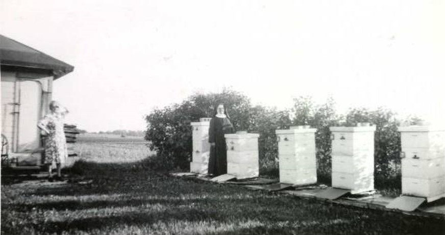 Sister Coletta Novak, Sister Mary Bratrsovsky’s great aunt, was the caretaker of the bees. She processed enough honey for the sisters and sold some as well. Her Sister, Marie Bartek in the background, was Sister Mary’s Grandmother and Sister Coletta’s Sister.