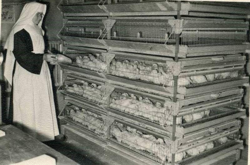 From 1936 to 1963, mostly under the direction of Mr. Rambousek, the sisters raised, slaughtered, ate and sold cows, pigs, chicken, ducks, and turkeys. At one point, around 1950, our records showed that 250 baby pigs were born each year in three farrowing’s of which about two-thirds were eaten by the sisters and students, the rest were sold. About 18 head of cattle were also slaughtered a year. We had around 60 head of cows and two bulls each year. Symphony, one of the two bulls, won the Reserved Grand Championship at the International Dairy Exposition at Indianapolis, Indiana, 1949.