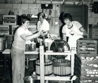 (From left to right) Sisters Mary Bratrsovsky, Barbara Ann Svec, and Helen Jilek enjoying making apple juice.
