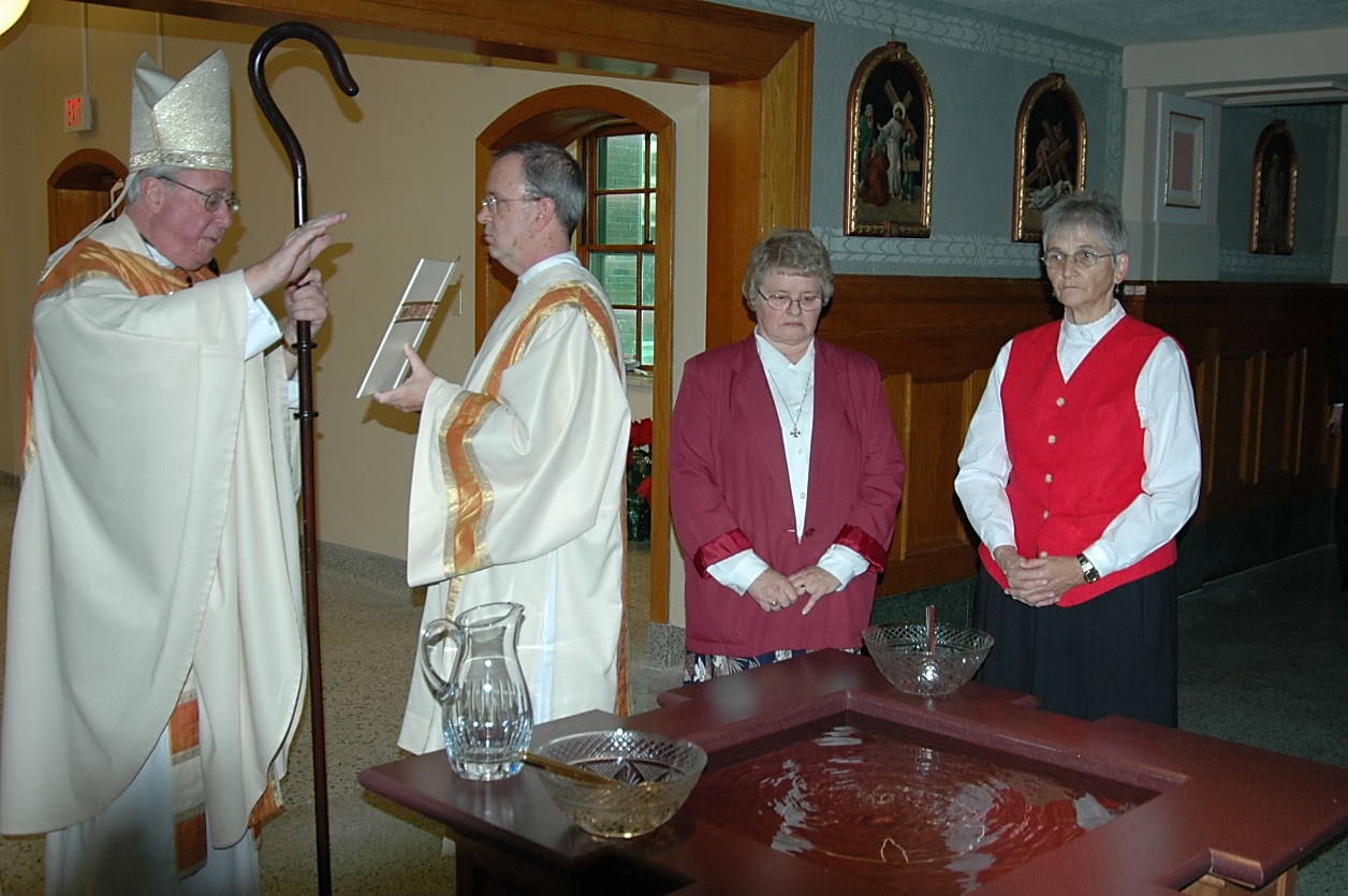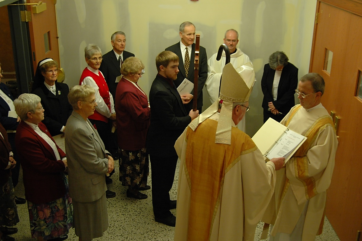 On December 18, 2005 after a full year of renovation Sacred Heart Monastery was re-dedicated. Most Reverend Joseph Imesch, Chaplain Becket Franks, OSB, Deacon Richard Hudzik and congregation stand and pray at the entrance to the chapel.