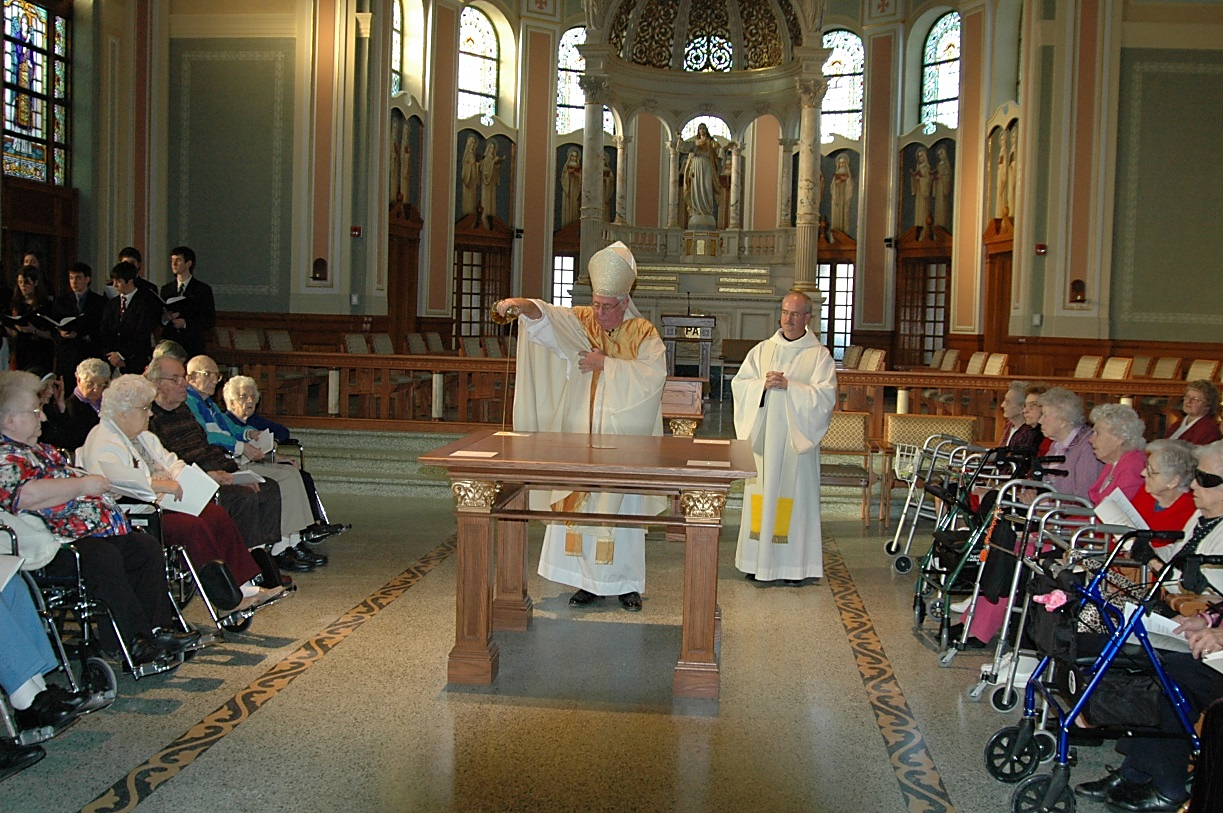 Bishop Imesch pours Sacred Chrism on the new altar constructed using marble from the old altar table and red oak. The appointments: Altar, Podium, Dedication Candles and Baptismal Font were constructed by Holtzmacher Company