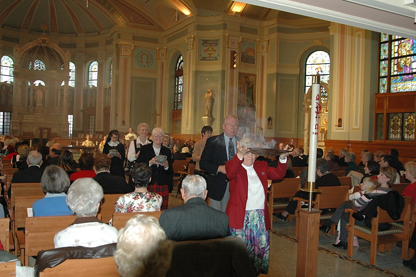 Bishop Imesch anoints the walls of the monastery chapel. The Benedictine medals mark the places of the anointings. Then, candles are placed in the places of the anointings to signify the Light of Christ.The brazier, which was placed on the consecrated altar was removed from the chapel.