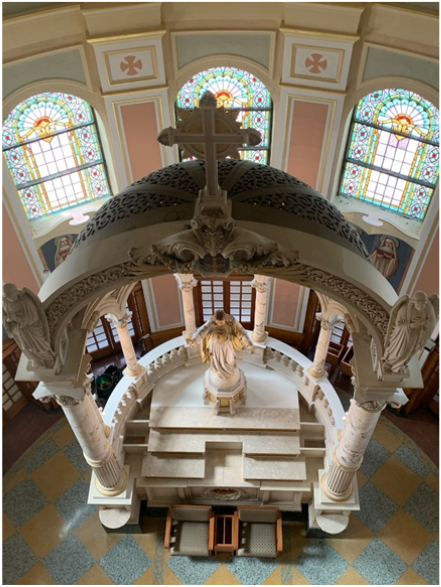 The Baldacchino in our chapel is the architectural canopy that is held up above the high altar. This unique view of our Baldacchino symbolizes its safeguarding value of something sacred. As you enter our Sacred Heart Chapel, your eye immediately is captivated with its magnificence. You notice that it encases a statue of the Sacred Heart of Jesus, whose outstretched arms are a sign that all are welcome to come to him as his heart burns with love for you and me and everyone.