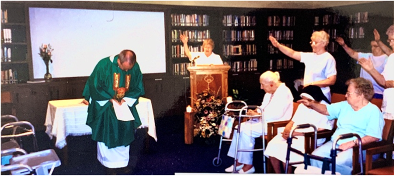 It was summertime and our chapel was not air-conditioned, so our Masses were held in the air-conditioned chapter room due to the intense heat of the chapel. Here you see the Sisters with raised arms giving Father Becket a welcome blessing. Interestingly, during our construction project of Villa St. Benedict, our chapel was not only air-conditioned but also remodeled for accommodating the residents with whom we now share the chapel. Since the renovation, we again appreciate being back in the chapel and are grateful for having Father Becket as our beloved chaplain for these 21 years. He has the gift of opening the scriptures for us with his relevant words of wisdom along with his inspiring liturgies.