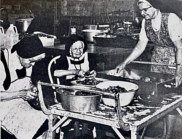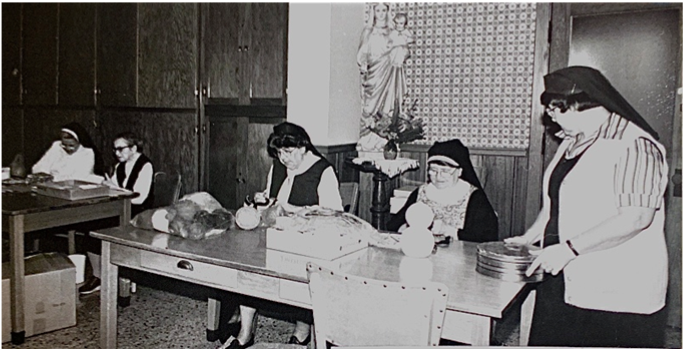 Sisters Jerome and Martha are seen mixing the ingredients and kneading the dough in separate stages of the baking process. Large quantities of dough were needed to form the loaves or the rolls to supply the needs of the Sisters and Academy students. Thank God they were provided with commercial sized ovens and the latest equipment to do their work. These Sisters were known for baking unrivaled, yummy baked goods. To smell these baked goods and to taste them was like eating the tasty fruits in the Garden of Eden.