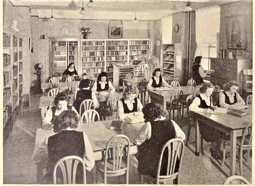 Sister Mary De Sales sits at her desk as the girls do their assignments during their free periods. Sister was very aware of the content of all the library books, and she was a helpful person to go to whenever the students needed to find information not listed in the card catalog. There were no computers then, but there were many books related to every subject that was taught.