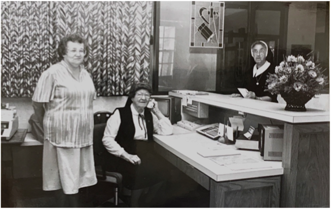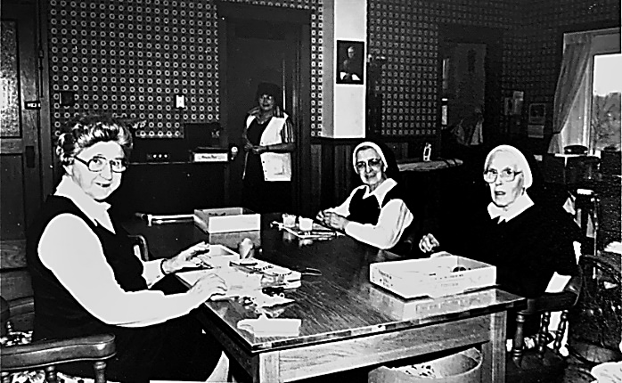 Sisters Lois Jean and Clarissa are seen sharing the daily schedule to answer the doorbell and telephone, and Sister Loretta is standing behind the desk. These were the days before the Sisters had private phones in their rooms. St. Benedict tells us that the porter (receptionist) is to be sensible and know how to take a message and deliver a reply. He as well advises, “As soon as a guest knocks, the receptionist is to say 'Thanks be to God' and then with all gentleness provide a prompt answer with the warmth of love.” In another place, Benedict tells us that all guests should be received as Christ. Hospitality has become a Benedictine hallmark.