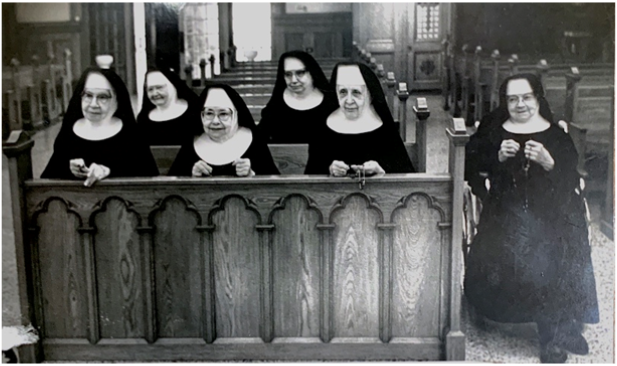 This happy group of Sisters contributed so much to community life. One can almost feel their holiness and joy as they pray the rosary. They were commissioned to pray daily for the special intentions requested by friends and families, and for those who needed the assurance of God’s grace if the Sisters were asked to connect with God for them. The Sisters in the first row are Sisters Gregoria, Jerome, Hermenegilde, and Agatha. The Sisters in the second row are Sisters Matilda and Lucy.
