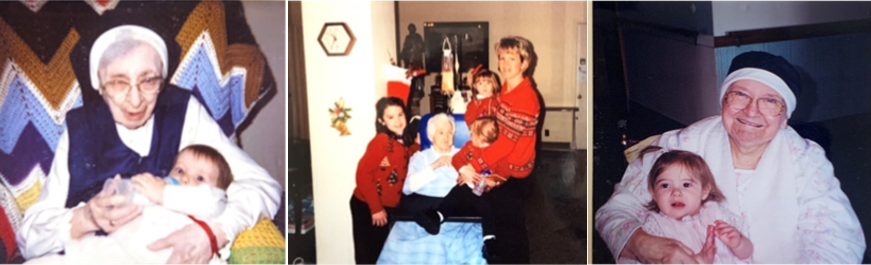 The Moms and Tots program was a monthly visit to our Sisters in our St. Walburga Care Center. What joy it would bring them! Here we see Sister Mary Bernard and Sister Mary Sefcik each holding a cherished baby while their mothers chat and get acquainted. In the middle picture, Sister Meinrada is admiring the Aument twins, Elizabeth and Emily, as their mother, Lynn, holds them while an older daughter, Danielle, cuddles up to Sister Meinrada.