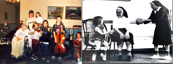 Whenever the lower grade children had a free day from school, their moms would bring them to entertain the Sisters with their musical instruments or to play catch ball with the Sisters. In the first picture we see Sister Mary Bernard, who was a former music teacher, listening gratefully to the two children playing violin and one playing the cello, while a mother with one of her tots stands back looking on. In the second picture Sister Mary Loretta and Sister Louis Mary play catch ball with 4-year-old Nora Kenny.