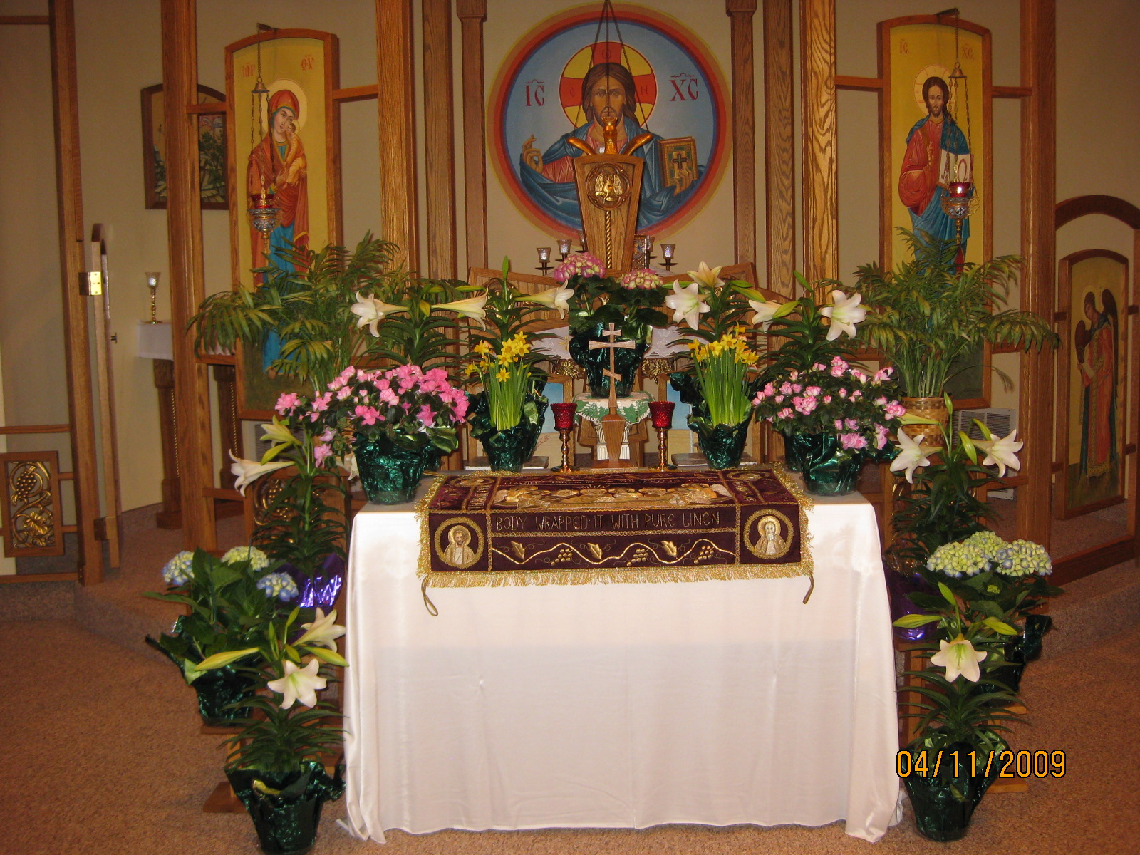 For forty days after the Feast of the Resurrection of Our Savior the Plachanitzyia (winding cloth) carried in procession during Vespers of the Great Good Friday, is placed outside the sanctuary for veneration. Before the Resurrection Matins begins, it is placed on the altar until Ascension Thursday.