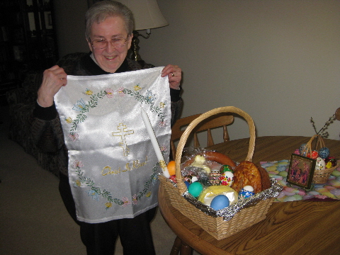 Sister Barbara prepared the traditional foods for blessing, as well as the baked paska. Sister holds the hand-made cover for the basket. Baskets are blest after Resurrection Matins.